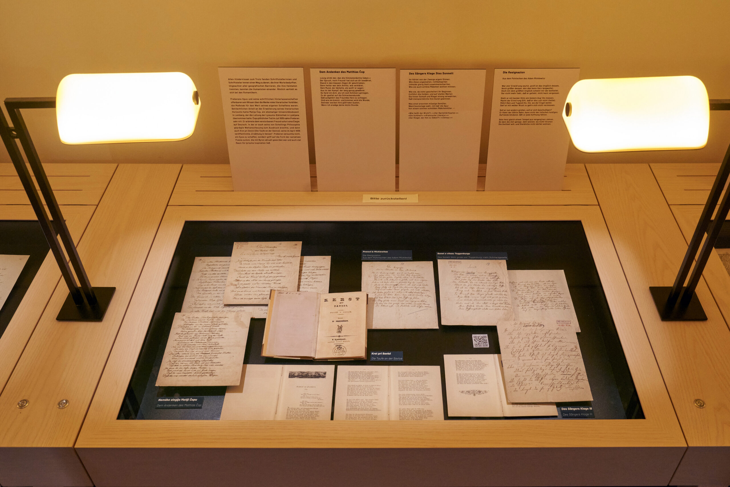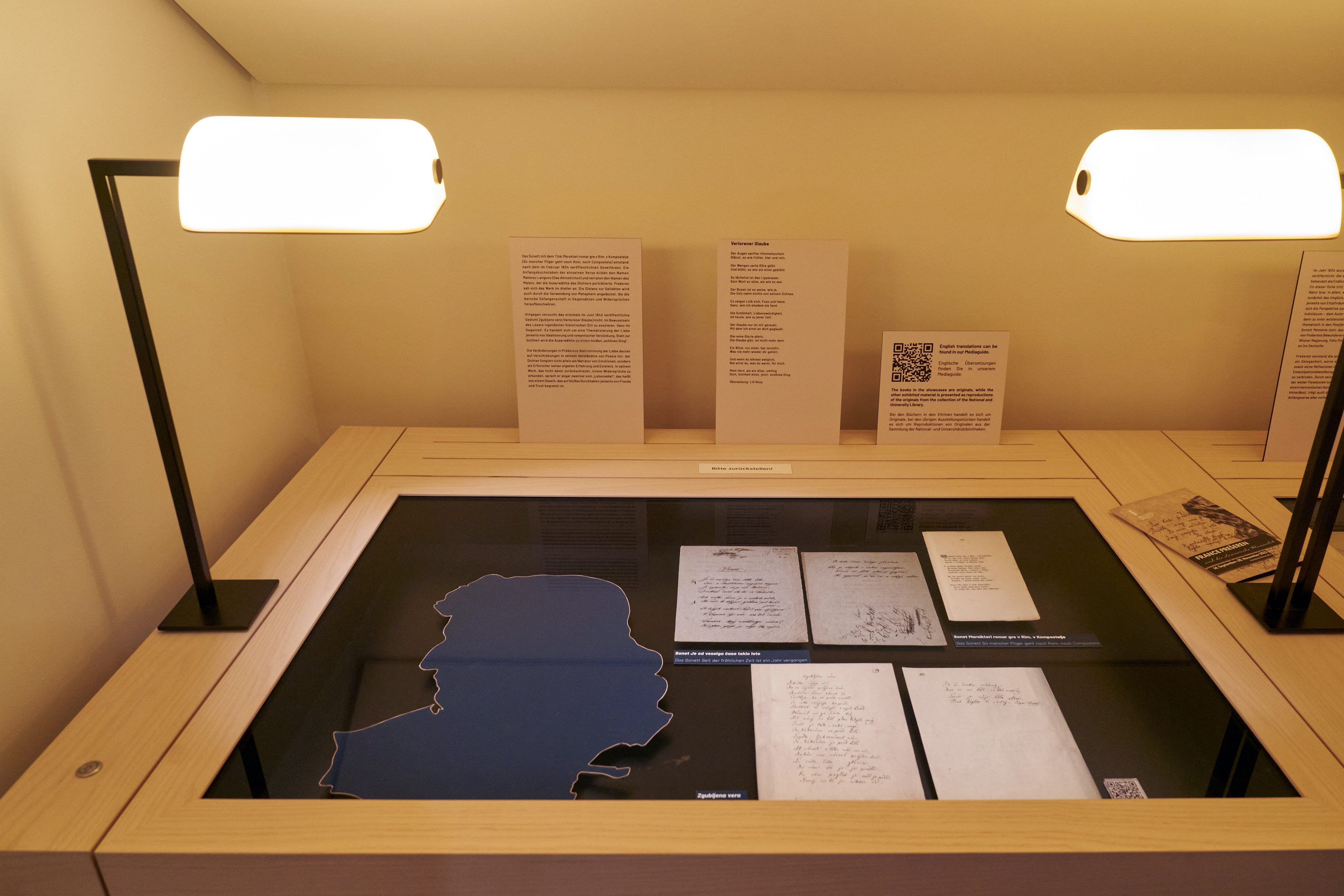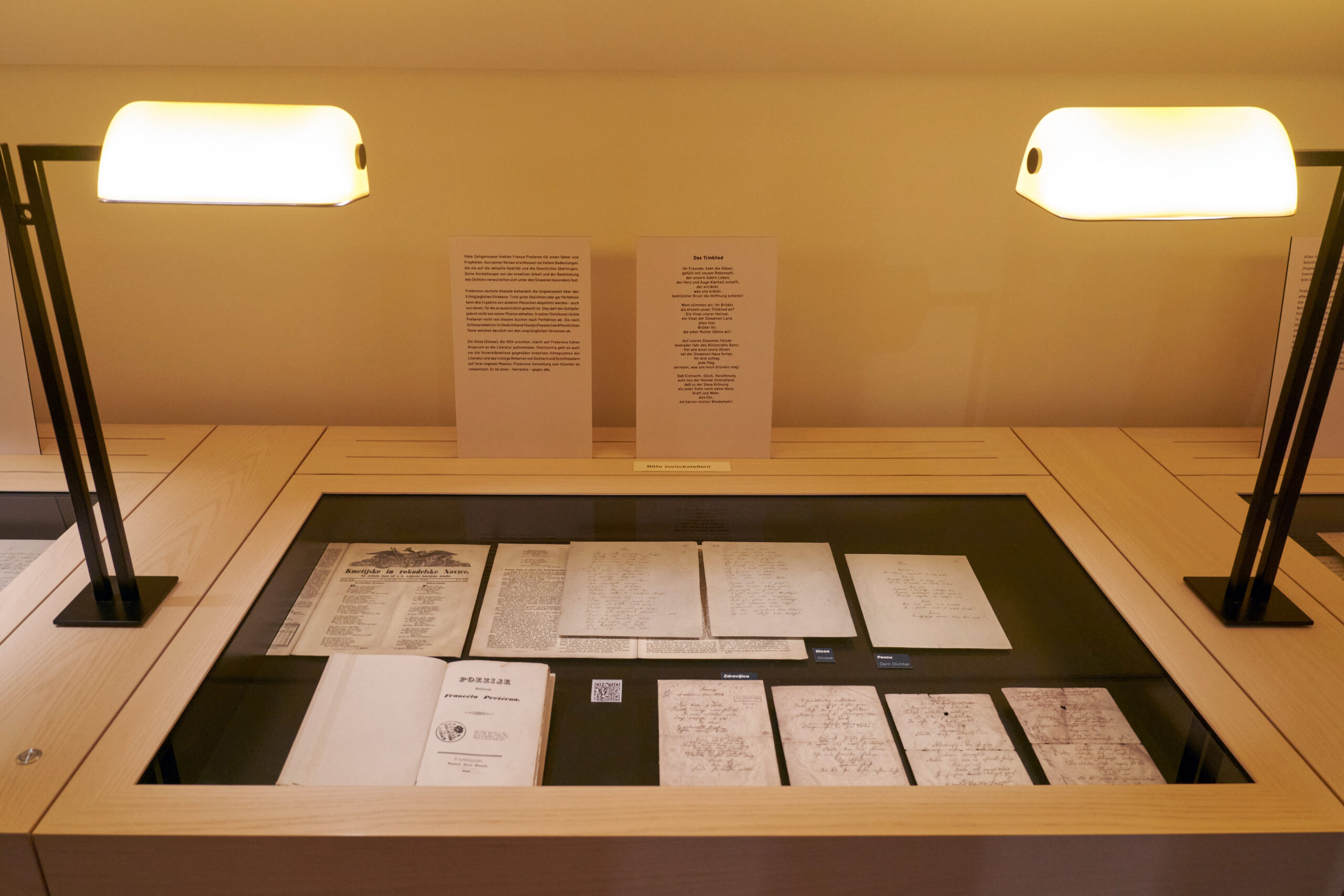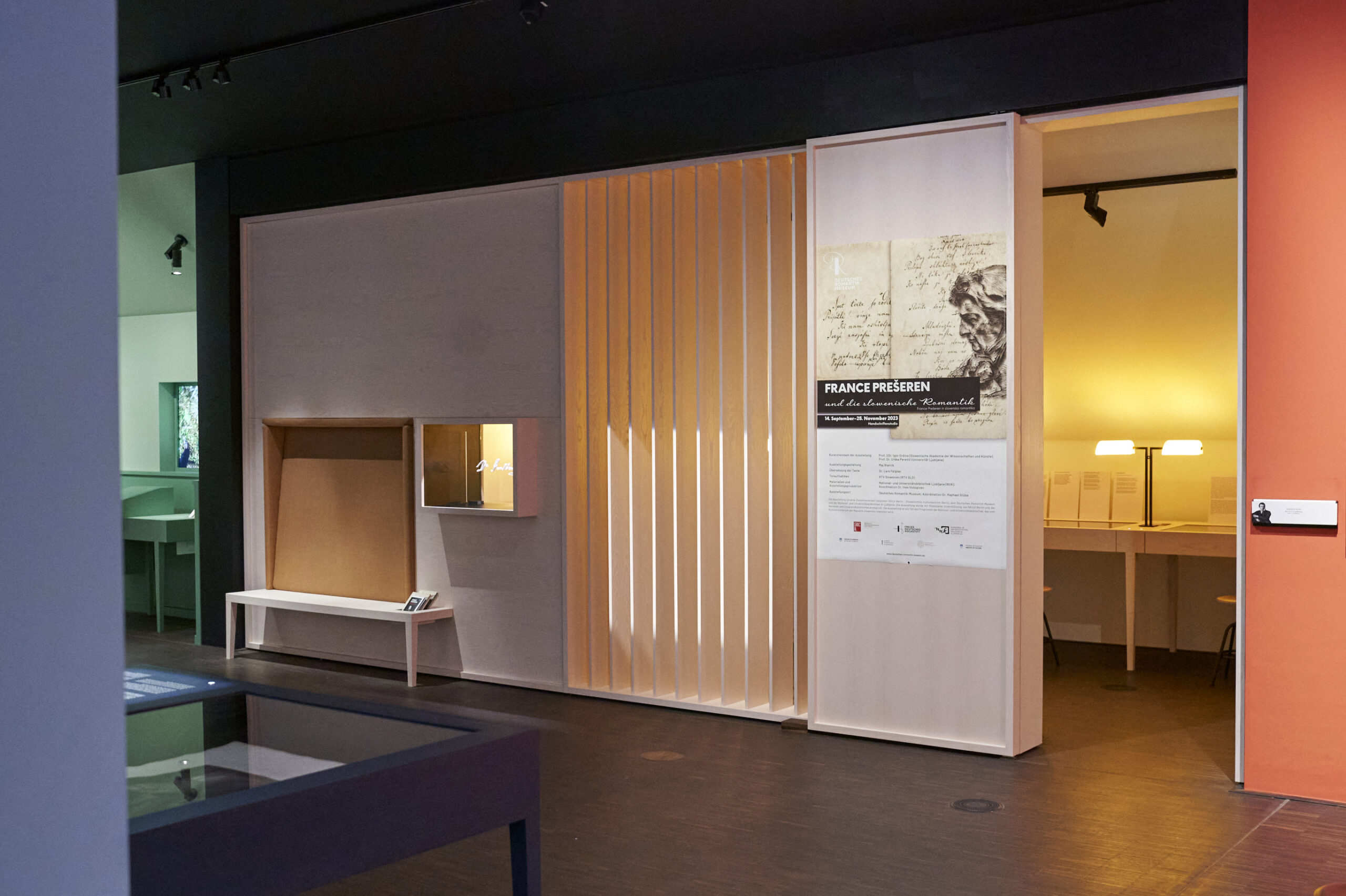 Die von Prof. Dr. Igor Grdina und Prof. Dr. Urška Perenič kuratierte Kabinettausstellung ist insbesondere dem größten slowenischen Dichter France Prešeren (1800–1849) gewidmet, dessen dichterisches Erbe einen bedeutenden Einfluss auf die slowenische und europäische Kultur hatte. Die Ausstellung präsentiert eine Auswahl der ersten und wichtigsten Manuskripte und Ausgaben der Werke von France Prešeren und seiner Zeitgenossin, der Dichterin und Schriftstellerin Luiza Pesjak (1828–1898), die in der National- und Universitätsbibliothek in Ljubljana aufbewahrt werden. Anhand von Briefen, Übersetzungen und Manuskripten sind das Leben und Werk von France Prešeren, der historische Kontext seines Werks und sein Einfluss auf die nächste Generation slowenischer Dichter vorgestellt.