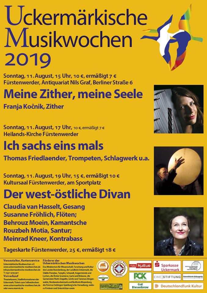 Sonntag, 11. August, 15 Uhr, 10 €, ermäßigt 7 € Fürstenwerder, Antiquariat Nils Graf, Berliner Straße 6 Meine Zither, meine Seele Franja Kočnik, Zither Sonntag, 11. August, 17 Uhr, 10 €, ermäßigt 7 € Heilands-Kirche Fürstenwerder Ich sachs eins mals Thomas Friedlaender, Trompeten, Schlagwerk u.a. Sonntag, 11. August, 19 Uhr, 15 €, ermäßigt 10 € Kultursaal Fürstenwerder, am Sportplatz Der west-östliche Divan Claudia van Hasselt, Gesang Susanne Fröhlich, Flöten; Behrouz Moein, Kamantsche Rouzbeh Motia, Santur; Meinrad Kneer, Kontrabass Tageskarte Fürstenwerder, 25 €, ermäßigt 18 €