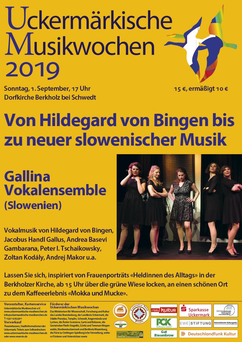 Uckermärkische Musikwochen 2019 Sonntag, 1. September, 17 Uhr 15 €, ermäßigt 10 € Dorfkirche Berkholz bei Schwedt Von Hildegard von Bingen bis zu neuer slowenischer Musik Gallina Vokalensemble (Slowenien) Vokalmusik von Hildegard von Bingen, Jacobus Handl Gallus, Andrea Basevi Gambarana, Peter I. Tschaikowsky, Zoltan Kodály, Andrej Makor u.a. Lassen Sie sich, inspiriert von Frauenporträts «Heldinnen des Alltags» in der Berkholzer Kirche, ab 15 Uhr über die grüne Wiese locken, an einen schönen Ort zu dem Kaffeeerlebnis «Mokka und Mucke».