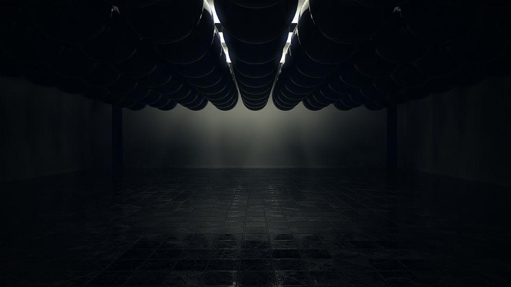 NINE ist eine kinetische Klangskulptur von Martin Bricelj Baraga und Olaf Bender (Rasternoton). Es besteht aus einer Matrix von 99 Luftballons, die eine immersive und doch intime Performance bilden. Während des Aufblasens umgeben die Ballons die Besucher und schaffen eine intensive physische, akustische und visuelle Erfahrung. Es ist ein dunkles Feld von Intensität, in dem Klang, Licht und Objekte ein- und ausatmen und in einem Raum pulsieren, der sich zusammenzieht und ausdehnt, wodurch eine sehr intensive, sogar klaustrophobische psychophysische und sozio-räumliche Erfahrung entsteht, die die aktuelle Situation in unserer Gesellschaft widerspiegelt.